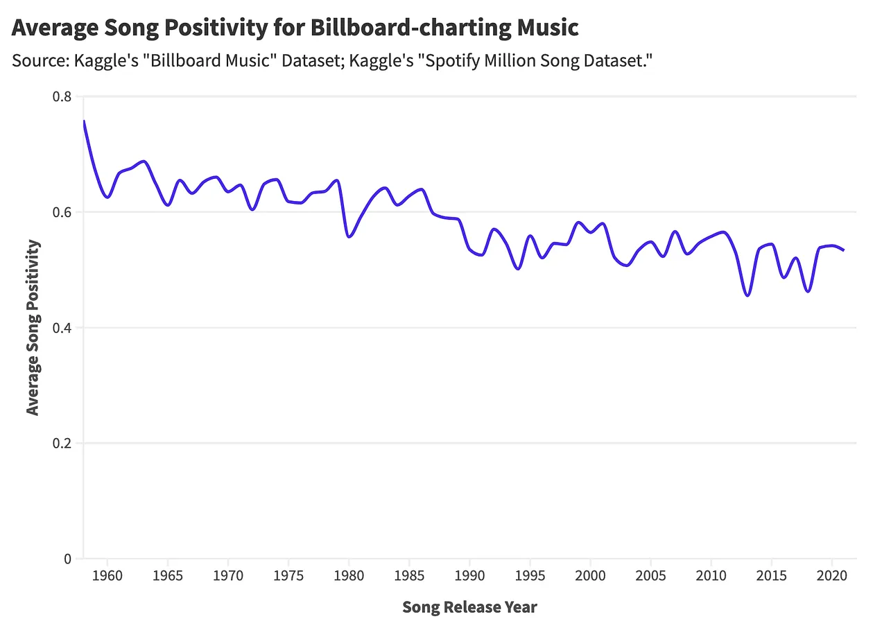 1960 年以降のヒット曲のポジティブさのタイムライン
