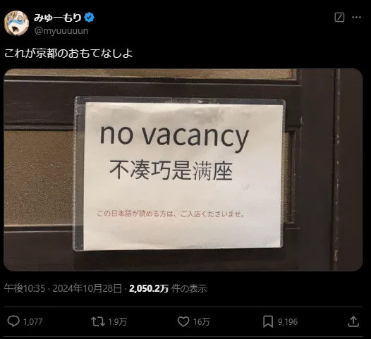 京都の別の店は、さらに賢い解決策を見つけました。彼らは、正面玄関に英語と中国語で「満席」と書かれた看板を掲げました。しかし、その下に小さな赤い日本語で「この日本語が読める方は、どうぞお入りください」と書いてありました。