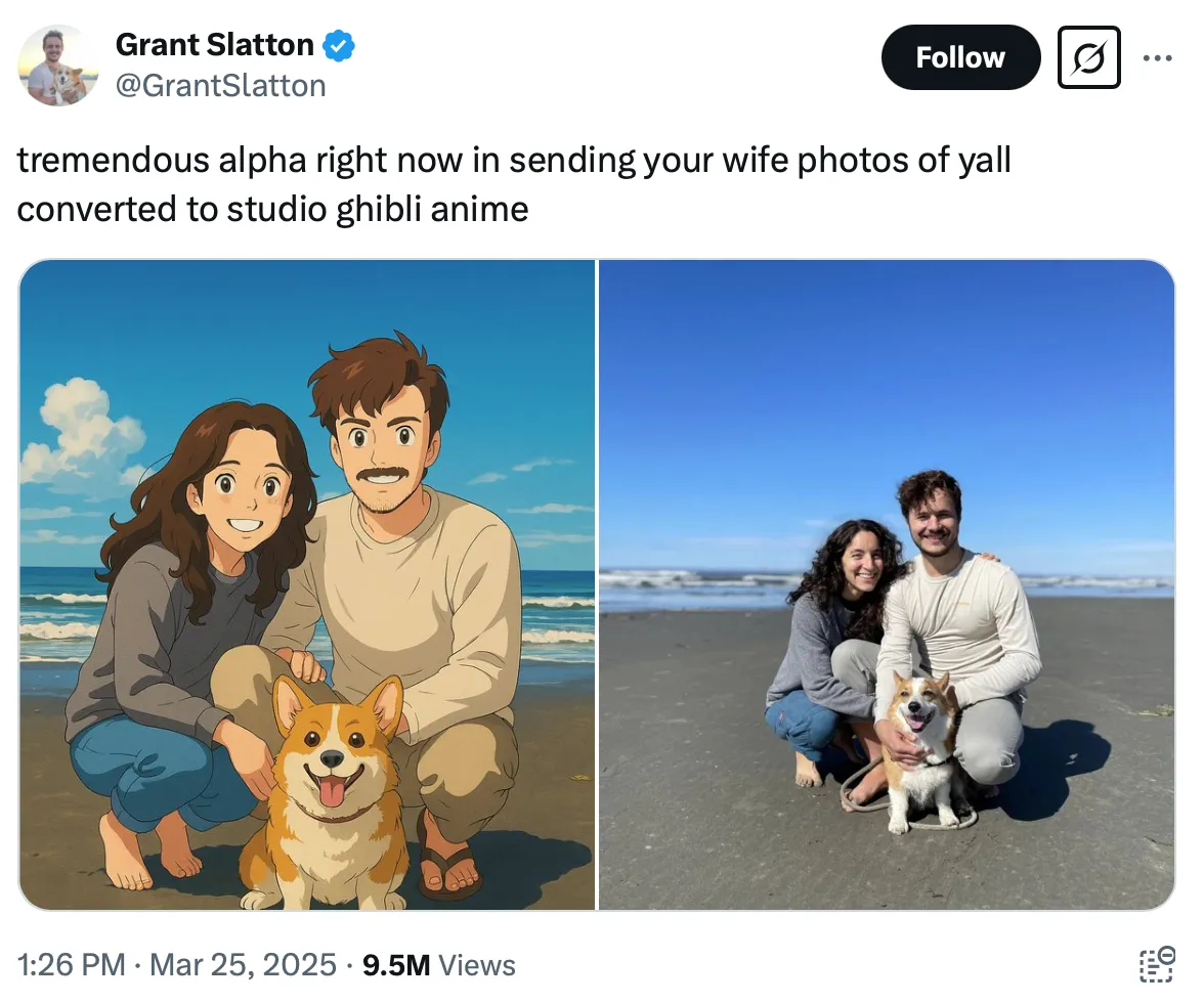 グラント・スラットンが「スタジオジブリのアニメに変換した写真を奥さんに送るのはすごいことだ」とツイートしたところ、35,000件もの「いいね!」がつき、突然Twitter全体が犬や奥さんの写真が何千枚も「となりのトトロ」風のミームで埋め尽くされた、という状況になった。