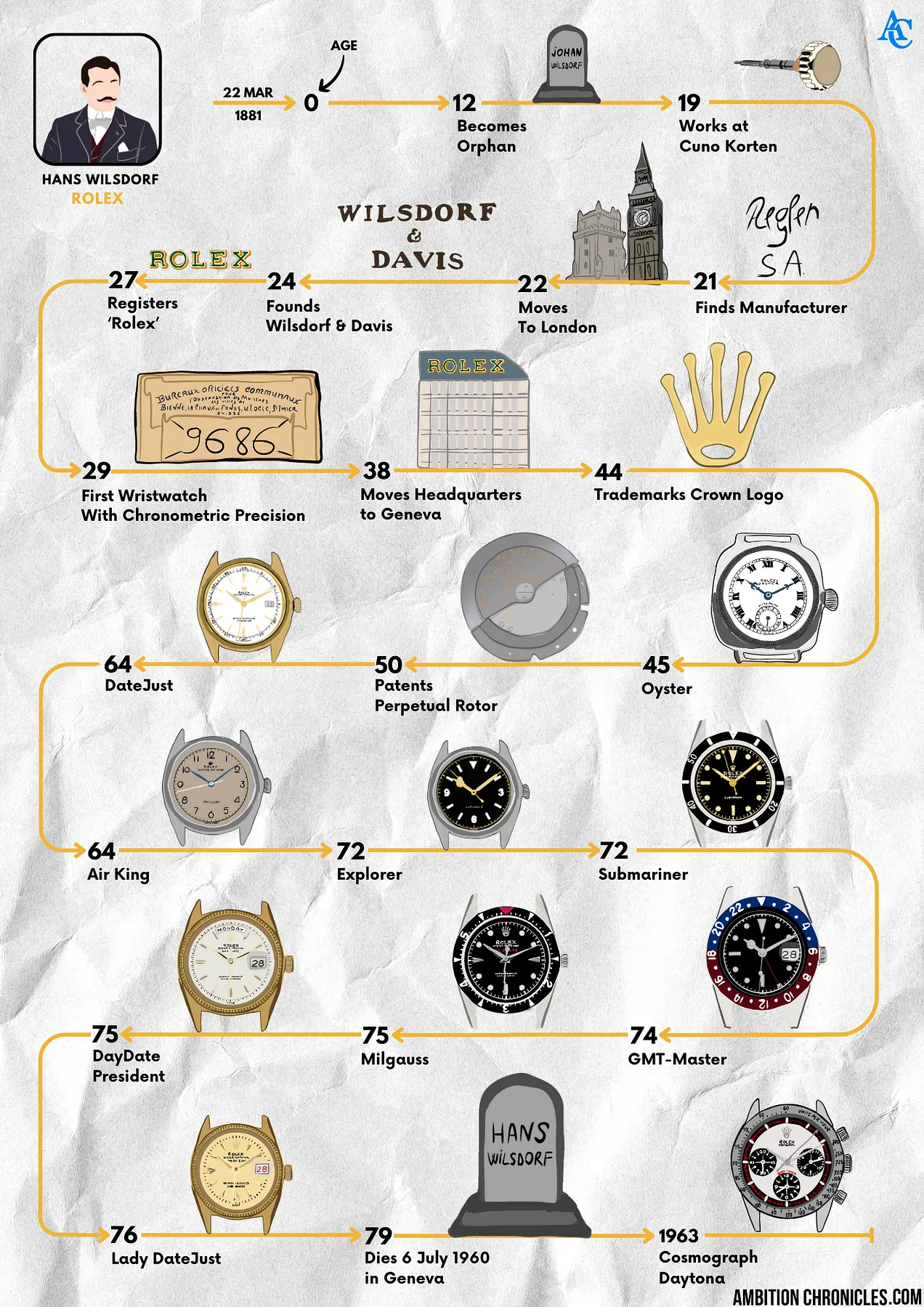1903年、22歳の時にロンドンに移り、ビジネスパートナーのデイビスと出会ってから2年後にウィルスドルフ&デイビス社を設立した。