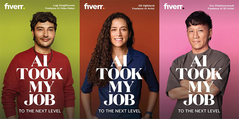 大胆にも “AI TOOK MY JOB” と大きな文字で書かれている。これだけだと「AIに仕事を奪われました」という意味になるのだが、その下の小さな文字で書かれた “TO THE NEXT LEVEL” を加えると、「AI のおかげで仕事のレベルが上がりました」の意になる。