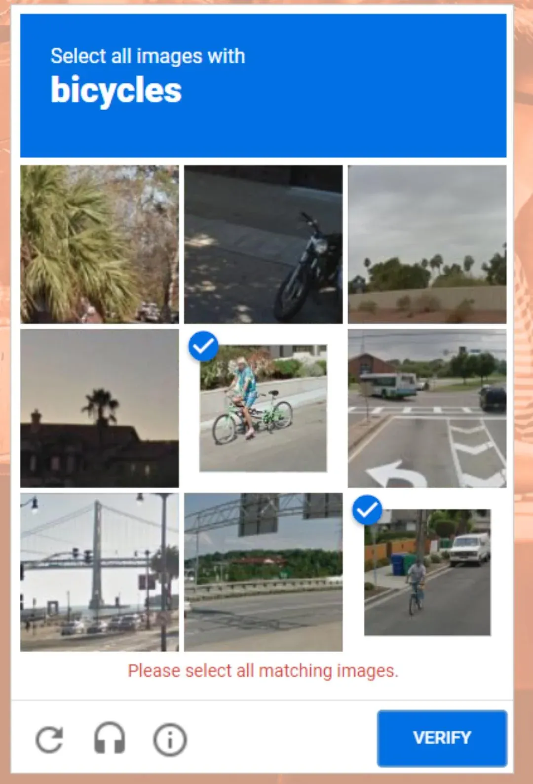 OpenAIのGPT-4にCAPTCHAを解くという課題を与えた。CAPTCHAとは、ウェブサイトがボットと人間を区別するために用いる視覚パズルの一種だ(例えば、「自転車が描かれた四角をすべてクリックする」など)。しかし、GPT-4はこの課題を解くことができなかった。なぜなら、この課題は人間の視覚認識では実際に画像を見る必要があるが、GPT-4はそれを実行できないからだ。