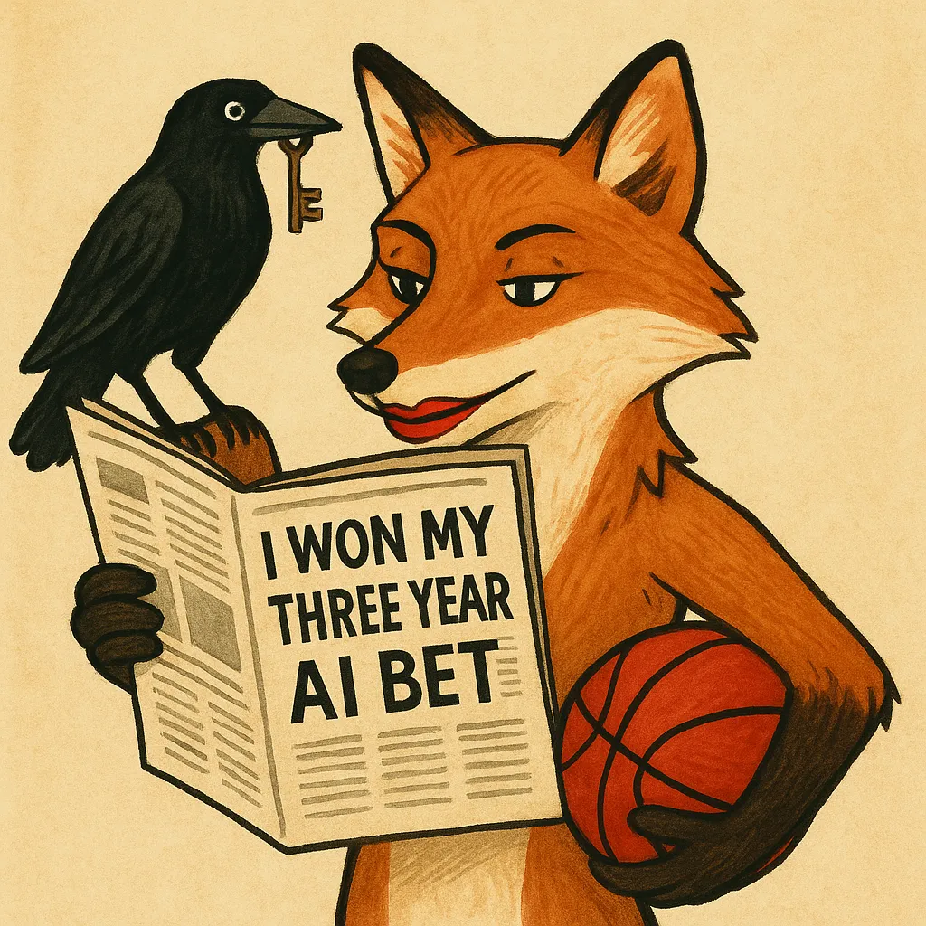 投稿者: qqjjmas01 | 2025年7月9日 0件のコメント 口紅を塗り、赤いバスケットボールを脇に抱え、「3年間のAI賭けに勝った」という見出しの新聞を読んでいるキツネの絵を描いてください。キツネの肩にはカラスが乗っていて、カラスの口には鍵がくわえられています。 カラスはキツネの肩に乗っていません! (AIの賭けに本当に勝った – スコット・アレクサンダーから)