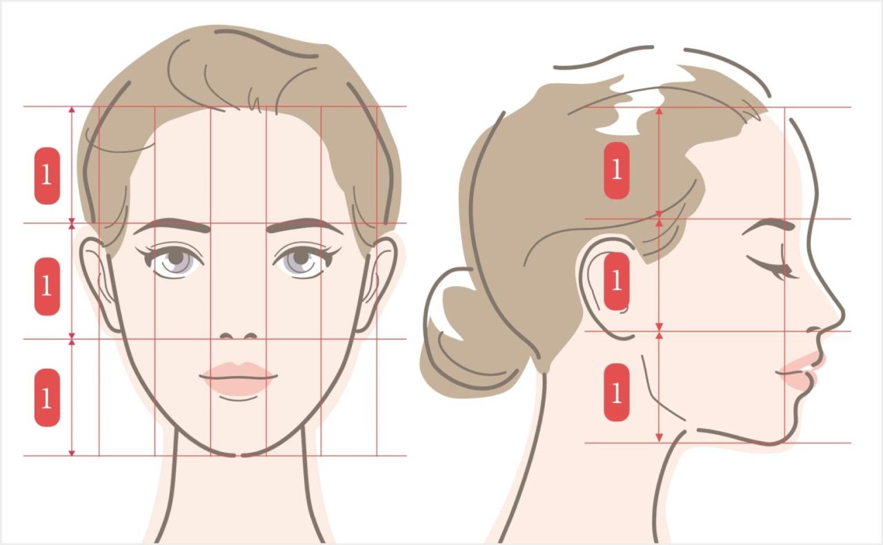 顔には美人に見える黄金比があります。「生え際~眉上:眉上~鼻下:鼻下~あご」はそれぞれ「上顔面:中顔面:下顔面」とし、その比率が「1:1:1」だと美人に見えると言われています。