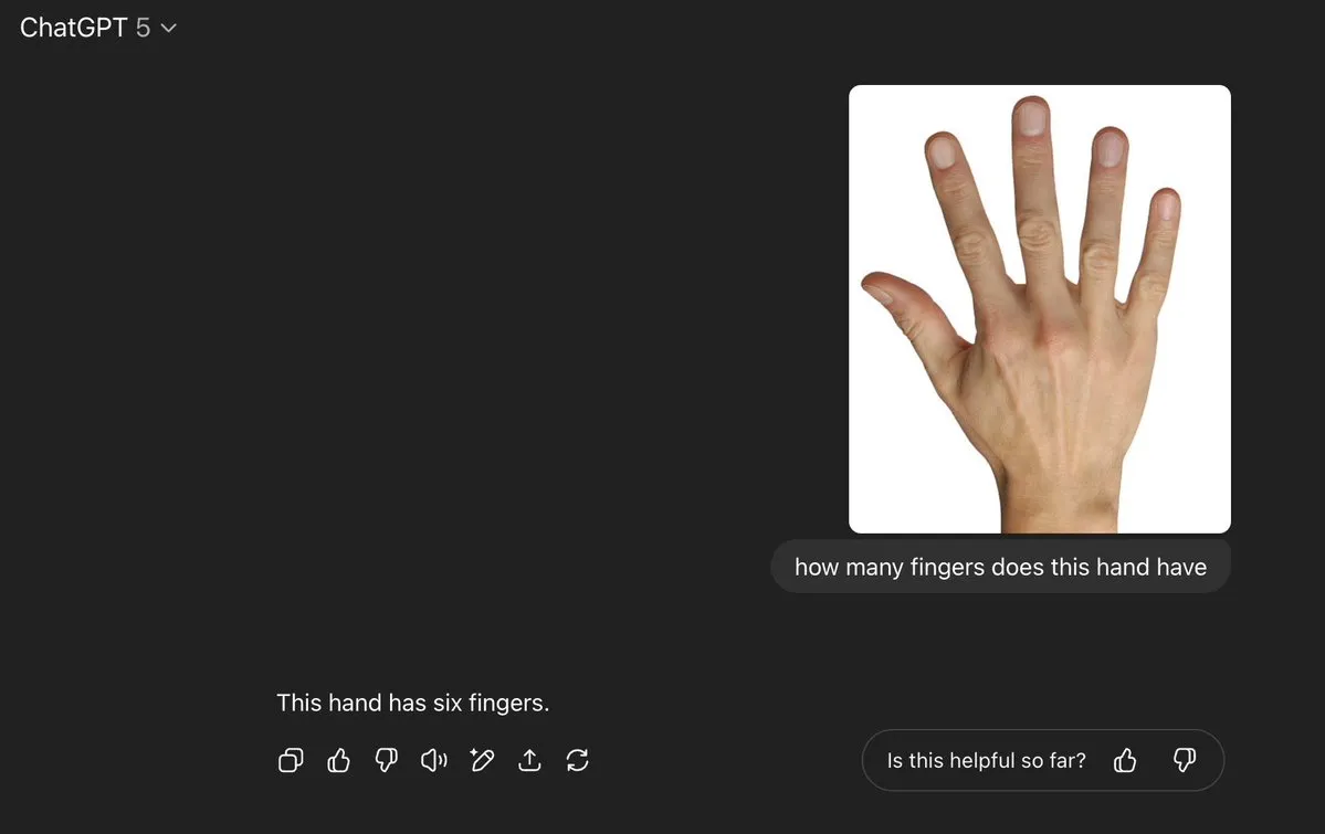 投稿者: qqjjmas01 | 2025年8月13日 0件のコメント 人間の手の写真をアップロードし、GPT-5に指が何本あるか尋ねたところ、「6本」と答えました。 (GPT-5は恥じるべき – エミール・P・トーレスから)