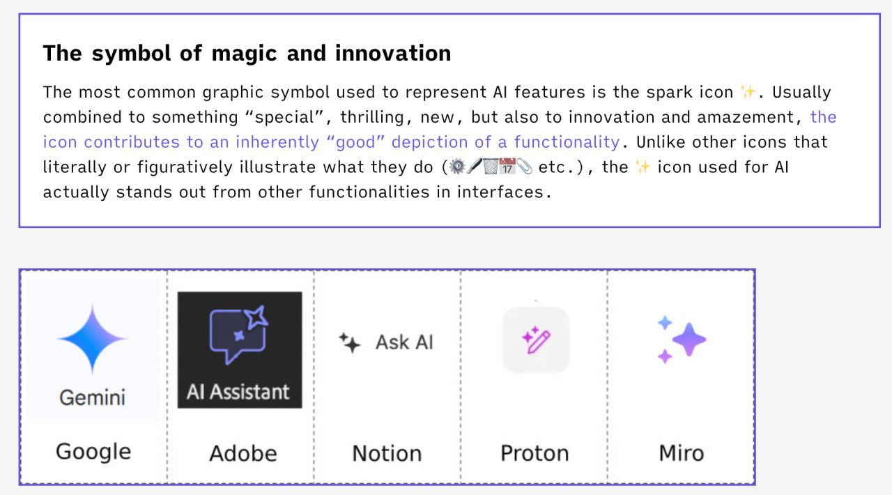 AIツールには、インタラクションを促すための専用ボタンが多数用意されており、企業間でも同じ色(藤色、落ち着いた青紫色)になっていることが多い。デザイン学者によると、この落ち着いた青紫色は魔法を暗示するものだそうだ。