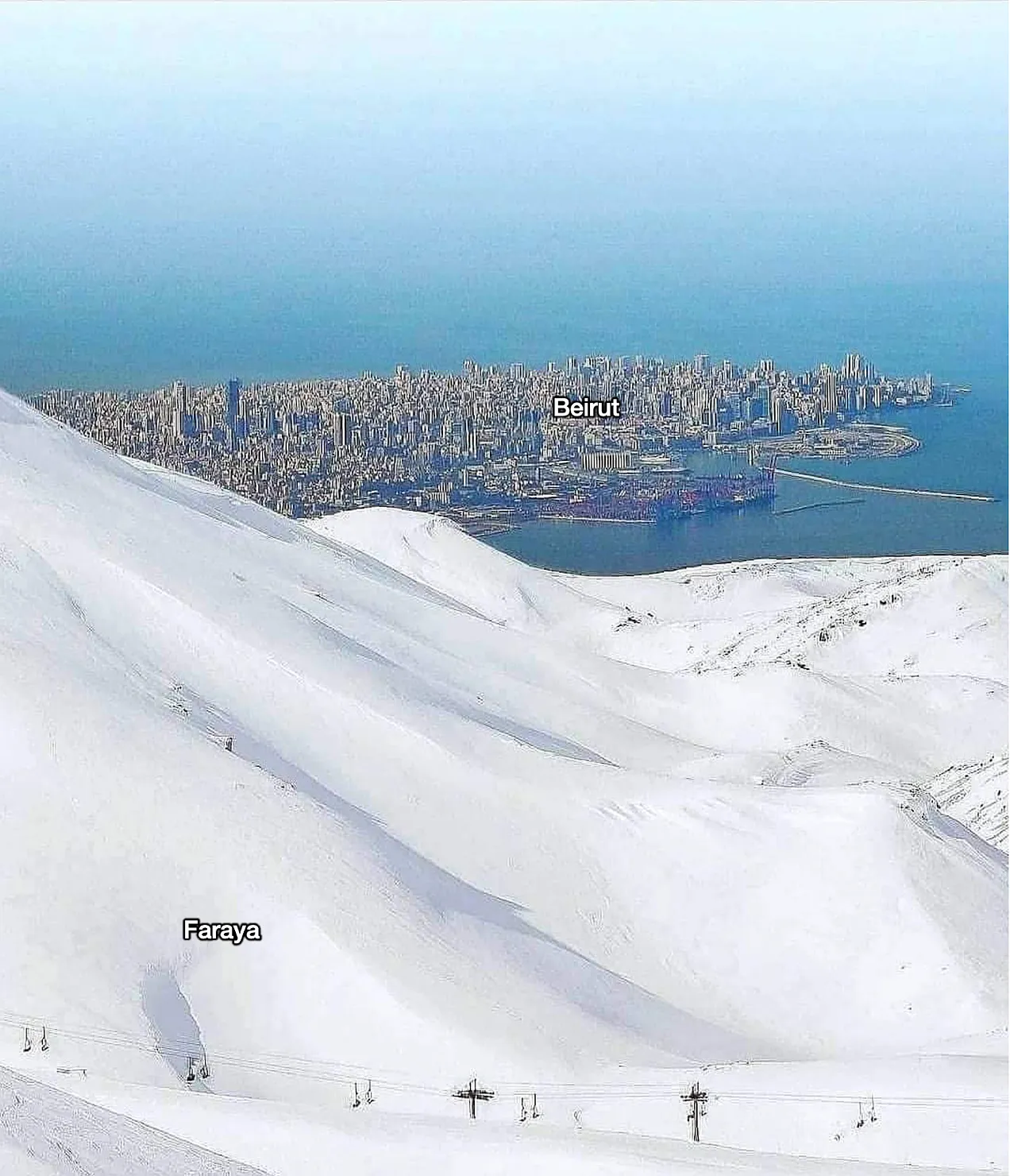 「レバノン」という言葉はレバノン山に由来しており、レバノン山は雪に覆われた山頂を意味するフェニキア語の「白」に由来しています。雪が積もったときの山から海までの眺めはこんな感じです。