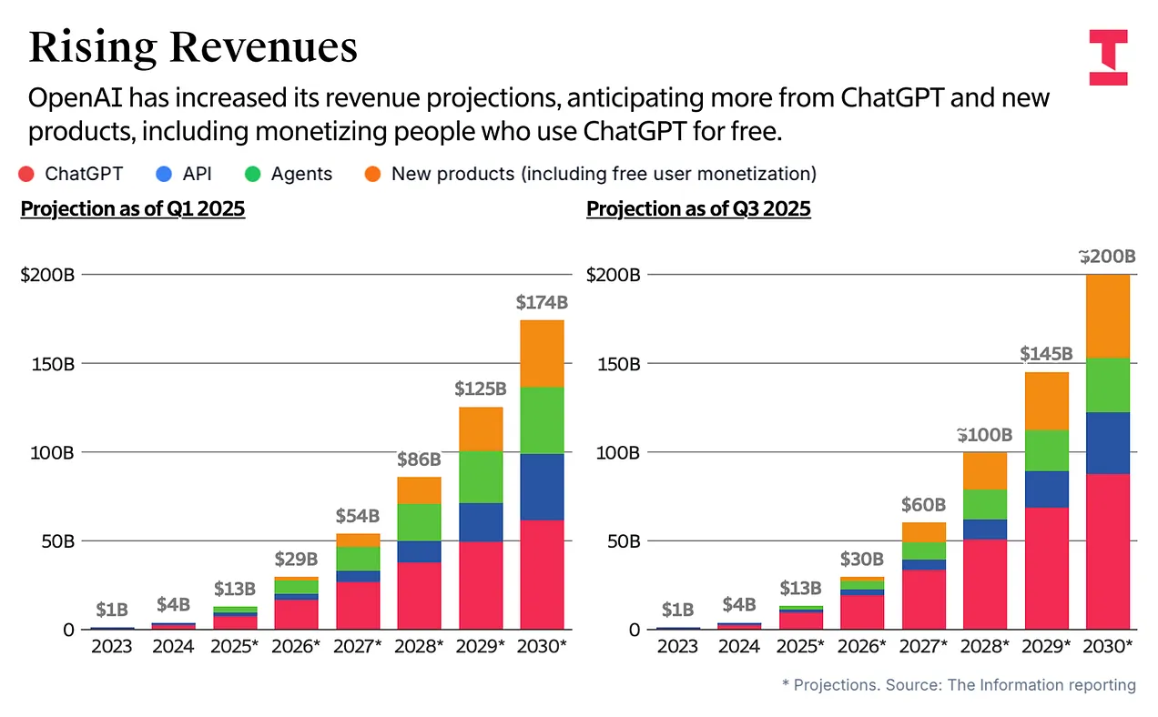 OpenAIは今年130億ドルの収益を上げており、来年は300億ドル、2027年には600億ドル、そして2030年にはなんと2,000億ドルの収益を上げたいと考えています。ご覧のとおり、OpenAIの収益予測は2025年を通してより楽観的になっています。年初には、同社は2030年の収益を「わずか」1,740億ドルと予測していました。