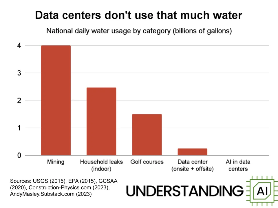 ローレンス・バークレー国立研究所の報告によると、2023年にはデータセンターの1日あたりの水使用量は約4,800万ガロン(約1億4,000万リットル)でした。他の用途と比較すると、これはかなり多いように思えます。AI関連のデータセンターは、ゴルフ場や鉱山と比較すると、水使用量が非常に少なく、バーの数字さえ見えないほどです。