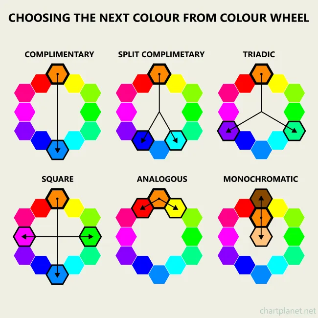 三角形— さらに 2 色が必要で、最初の色をあまり目立たせたくない場合は、ホイールに三角形を描き、端にある色を選択します。