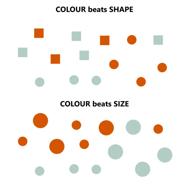 色は視覚的な認知を支配するため、私たちは色を重視する傾向があります。色と形に関するカテゴリ情報をエンコードすると、読者はまず色に基づいてカテゴリを認識します。