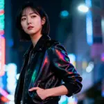 プロンプト:印象的な一重まぶたの韓国人若い女性が夜の街路に立つ、映画のようなミディアムショット。彼女の表情は自信に満ちながらも謎めいている。スタイリッシュな黒のレザージャケットを羽織っており、素材はリアルな光沢を放ち、ネオンライトを反射している。彼女は片手をジャケットのポケットにさりげなく入れ、親指はポケットの外側に出している。鮮やかなネオンサインの光がシーンを照らし、ジャケットと肌に色鮮やかな反射を生み出している。背景には街灯によるカラフルなボケが広がっている。ARRI Alexaカメラで撮影し、シネマティックカラーグレーディングを施した。