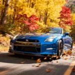 プロンプト:秋の陽光降り注ぐ山道を疾走するベイサイドブルーのNissan GTR R35を捉えた、プロ仕様のパンニングショット。車はピントがくっきりと合っており、背景の鮮やかな黄色と赤の秋の森は、水平方向のモーションブラーの美しい筋となっています。車の後ろには、舞い散る落ち葉が映っています。ローアングルから捉えたこの写真は、アグレッシブなフロントエンドを捉えています。メタリックブルーの塗装が、ぼやけた背景の色をリアルに映し出しています。デジタル一眼レフカメラで1/30秒のシャッタースピードで撮影された、まさに自動車写真の傑作です。